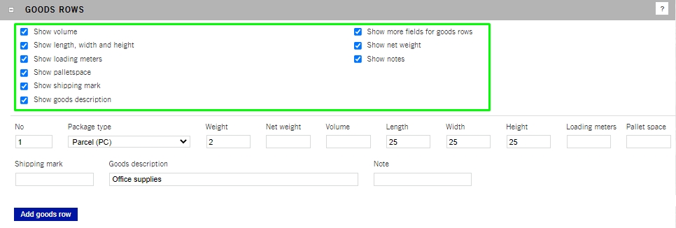 - Scroll down to the GOODS ROWS section and click Add goods row. Add as many as you need.