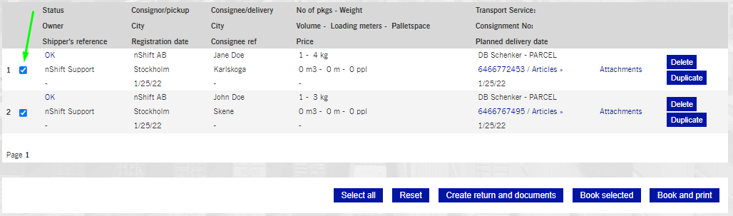 - Select the shipments you want to book. You can use the filters to search for the relevant shipments.
