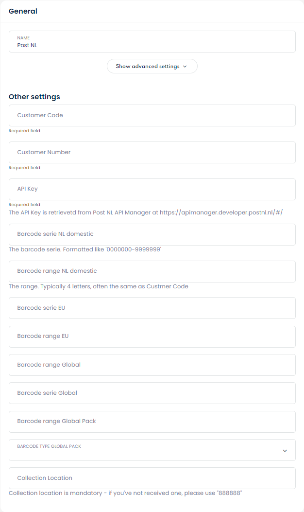 Navigate to Connect > Carriers > Create Carrier > Post NL. Fill in the required details and click Create Carrier when finished.