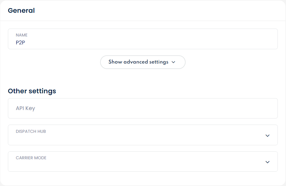 Navigate to Connect > Carriers > Create Carrier > P2P. Fill in the required details and click Create Carrier when finished.