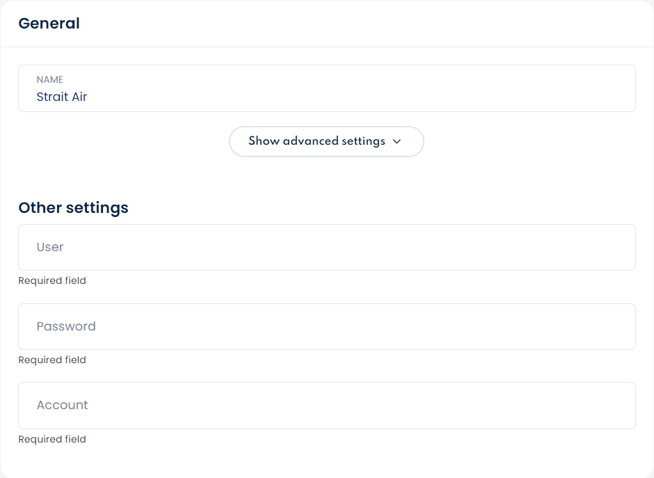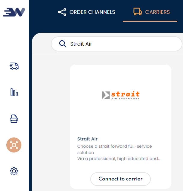 To get started using Strait Air as a carrier in Webshipper, navigate to Connect > Carriers > Create carrier > select Strait Air from the list and click Create carrier.