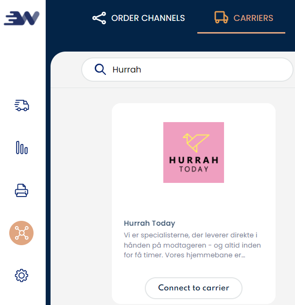 To get started with Hurrah Today go to Connect > Carriers > Create carrier and find Hurrah Today in the list and click Connect to carrier.