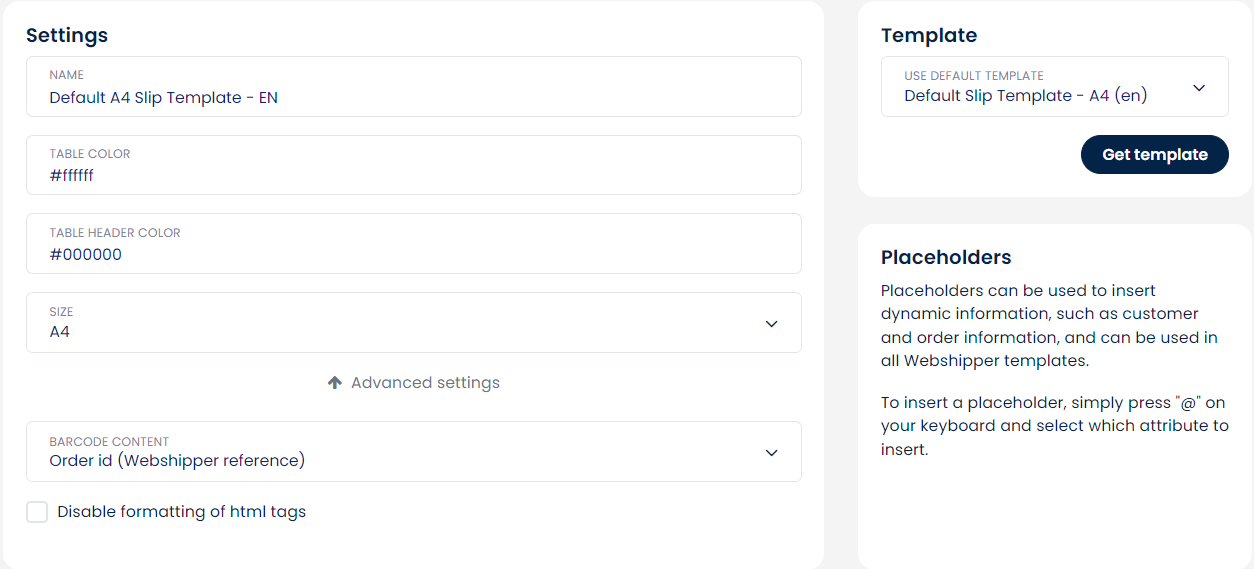 Webshipper provides a parcel slip for order overview and packaging. You can find it by going to Settings > Parcel slips > Create Template size A4.