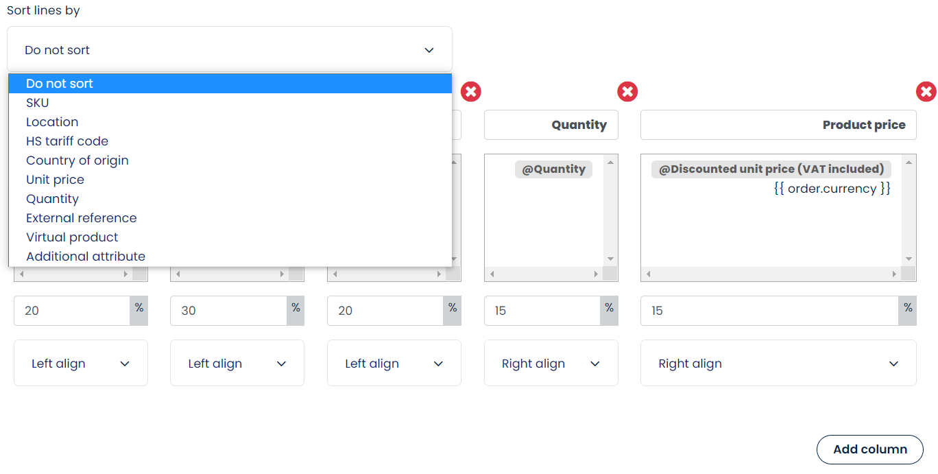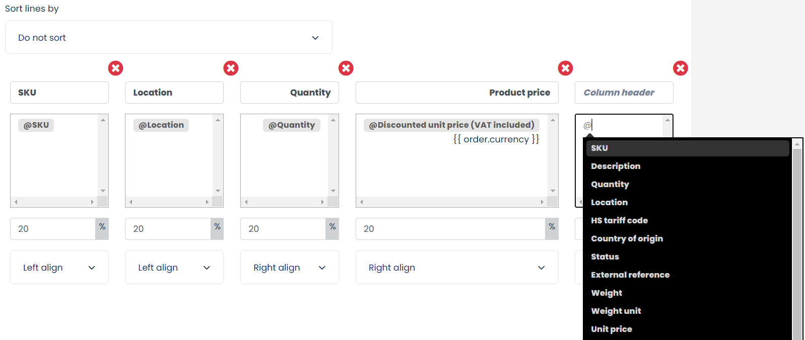 Once you have defined the sorting, you are now able to build columns in your table. We have made five columns for you already but if these are not relevant for you or need changing, it's rather simple to update them. Simply press "Add column" and a new column will appear. Give this column a header name and fill in the content box with a "@" to trigger the most commonly used placeholders.