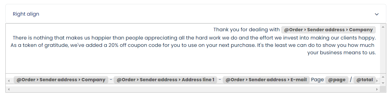 When you have defined the details for the template frame in the top section you can start to edit the content of the template. In the default template, you will see a header and two columns. This is the first part of the visible content of your parcel slip. It is built with placeholders that can be put together just the way you like it to be.