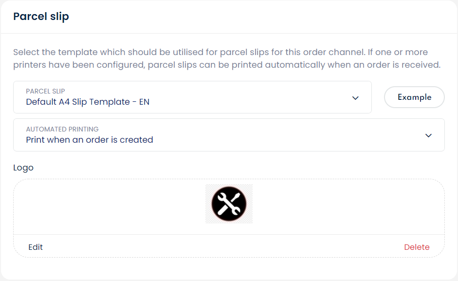Finally, you might want to add the logo and start to use this new template you have created. Simply navigate to Settings > Order channels > select your channel > Edit order channel scroll down to Parcel slips