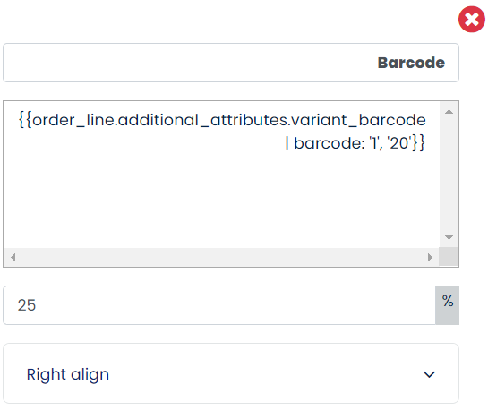 {{order_line.additional_attributes.Custom1}}Example from a customer using Barcodes as attributes: