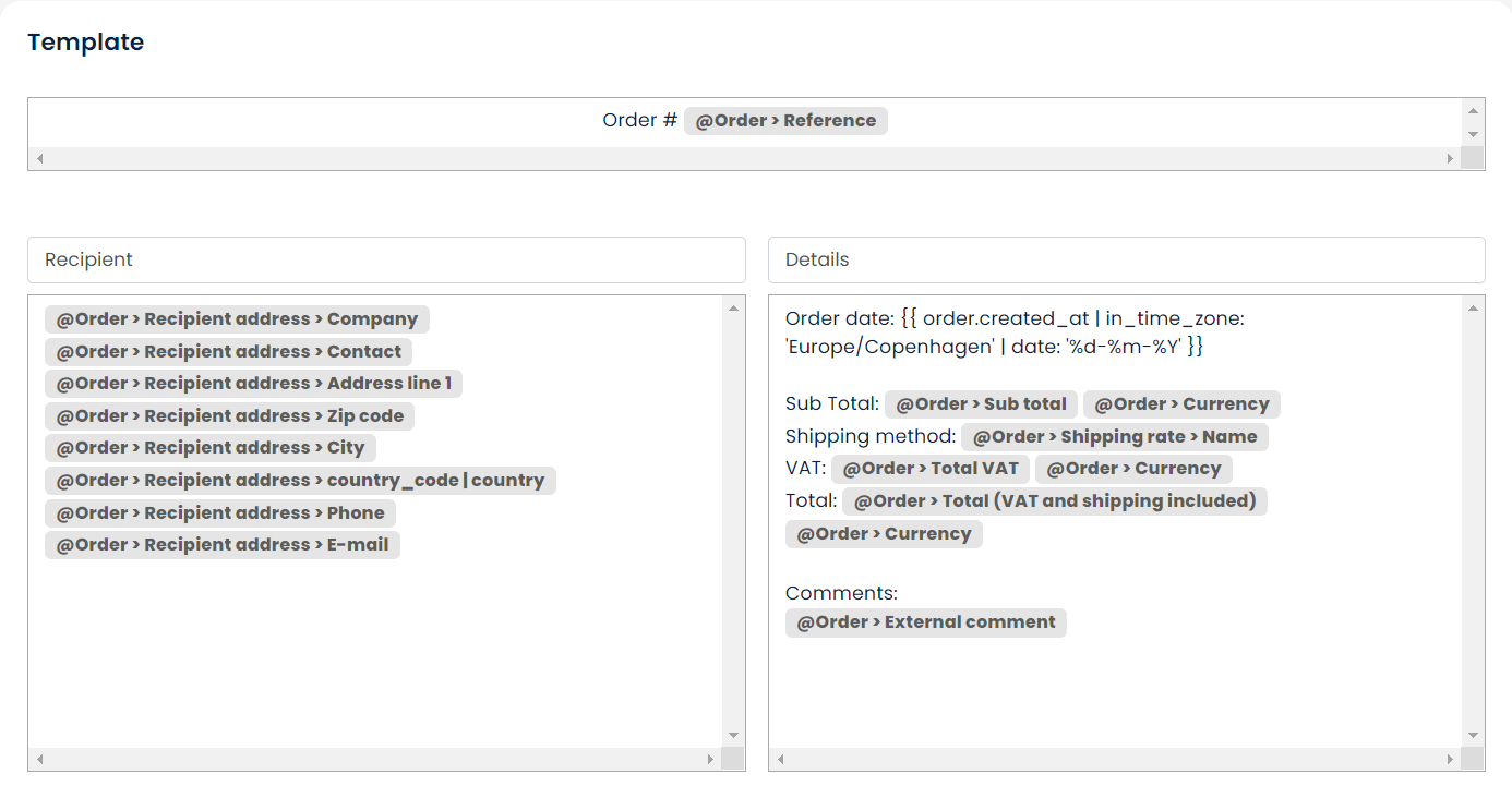 When clicking Example at the top, you can continuously see what the template will look like before saving the template. This is useful for active templates however if you create a new one you can save the template as often as you like as the template will not be active before you choose to do so inside your order channel.