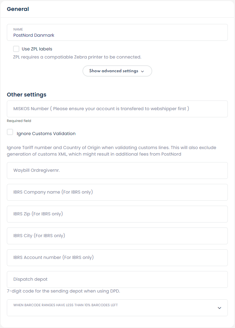 Insert a carrier name and insert your MISKOS number for PostNord. If you are in doubt about your MISKOS number, please read this article: PostNord Carrier Information