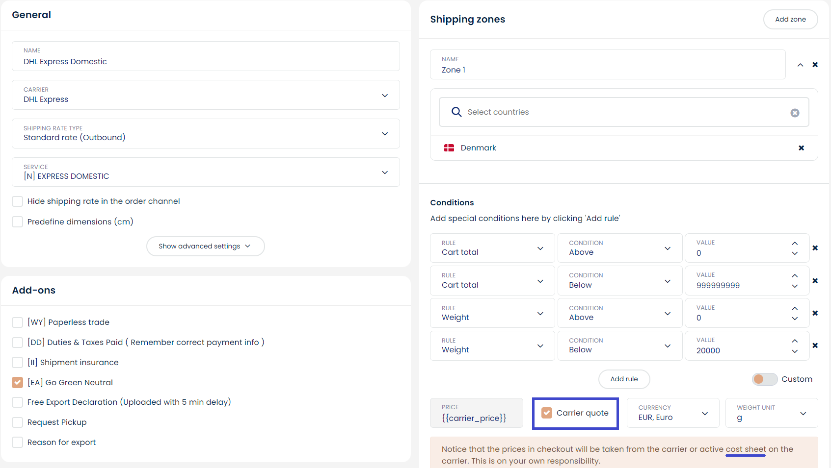 After 'Carrier quote' has been activated, the shipping rate will now request prices from the Freightsolution API instead of a static price set on the rate in Webshipper.