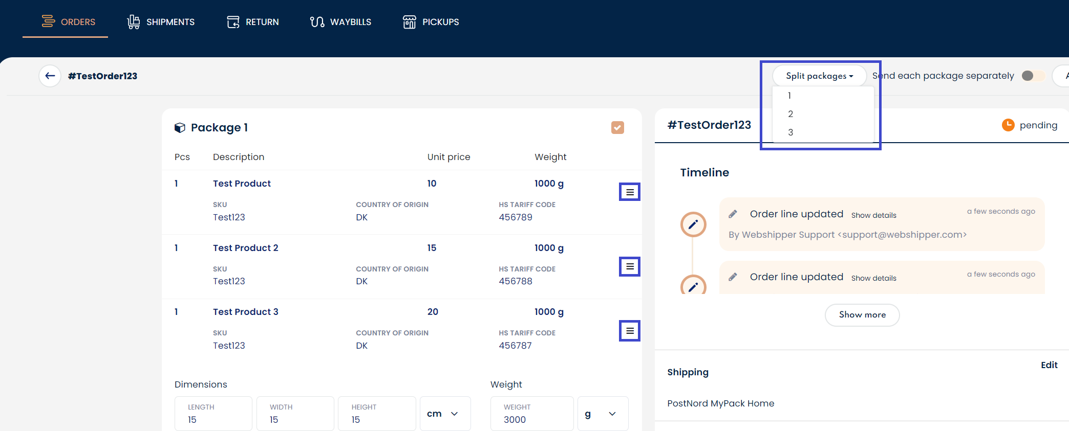 Webshipper makes it easy to handle multiple parcels and shipments for a single order.