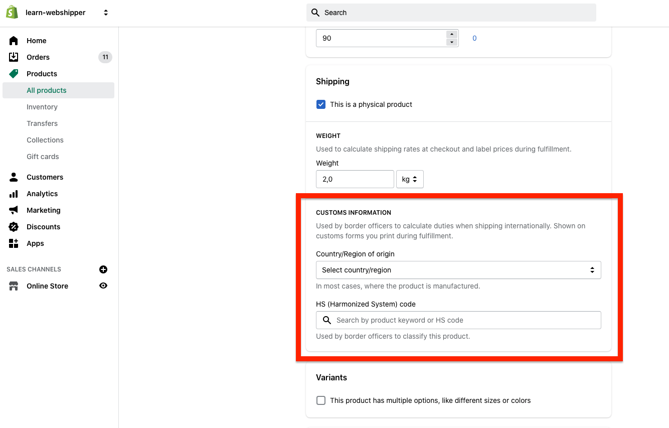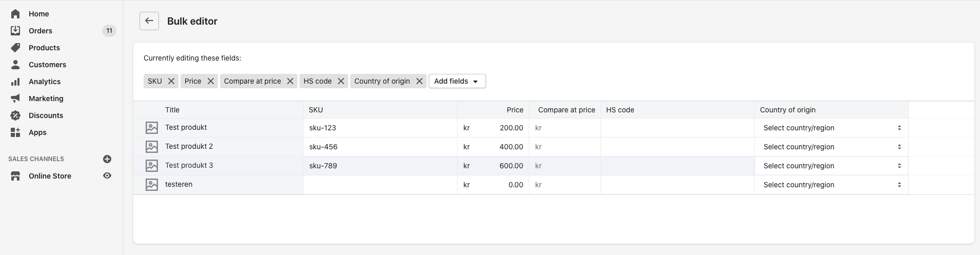 Click Add fields and find HS codes and Country of Origin.