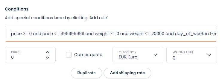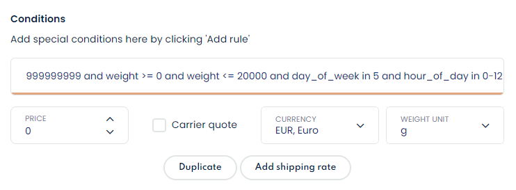 Sometimes it may be necessary to create a limit to when a shipping rate should be available to customers in checkout. This can be created in Webshipper using conditions on the shipping rate.