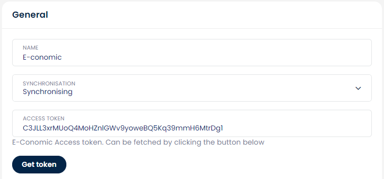 - Insert your Economic access token. You can do so by clicking Get token. If you are not already logged into your e-conomic account, you will be asked to log in to add the Webshipper app. When you click the button you will be redirected to e-conomic and see an API token. Copy the token by right-clicking on it and then paste it into your Webshipper access token field.