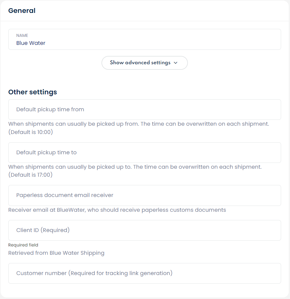 To start using Blue Water, you will need to create them as a carrier. To do this, go to Connect > Carriers and find Blue Water in the list. Select it and click "Create Carrier".