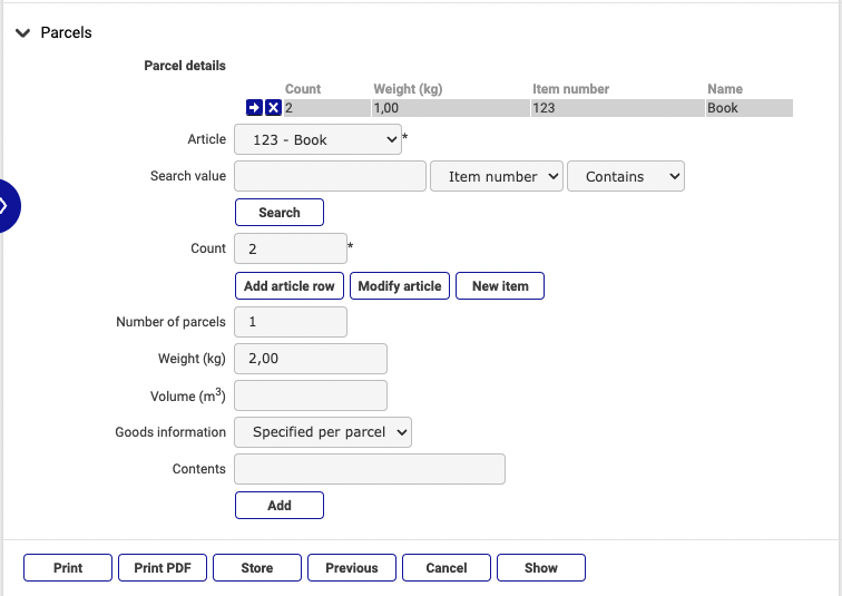 When you add the items, the information is not aggregated in the item row. For example, if two items with a weight of 1 kg each are registered, "1 kg" is shown in the item list. The weight for the parcel equals the total of all items, that is, "2 kg".