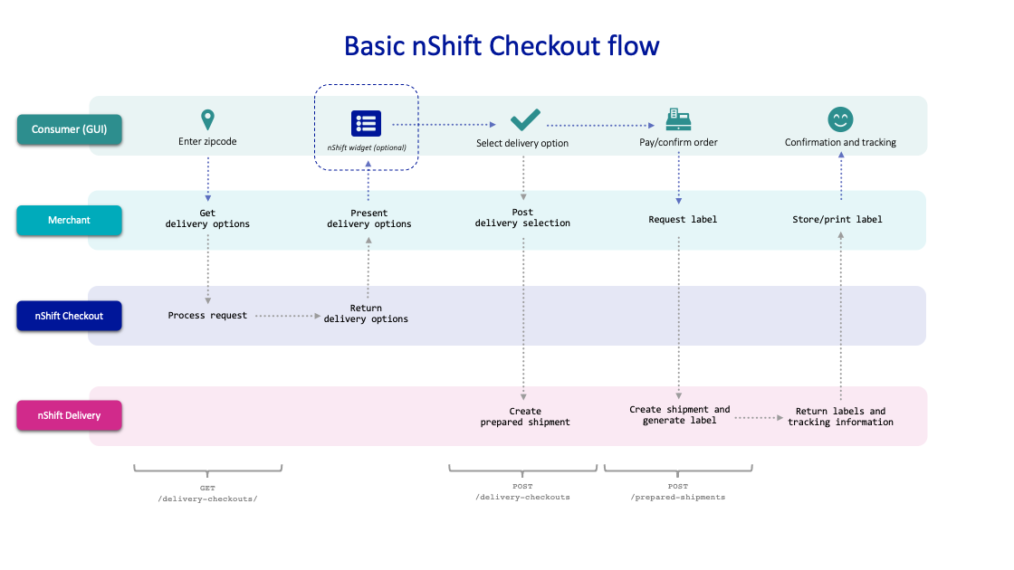 DeliveryCheckout API uses a REST API framework for communication with JSON as data carrier offering a number of functions.