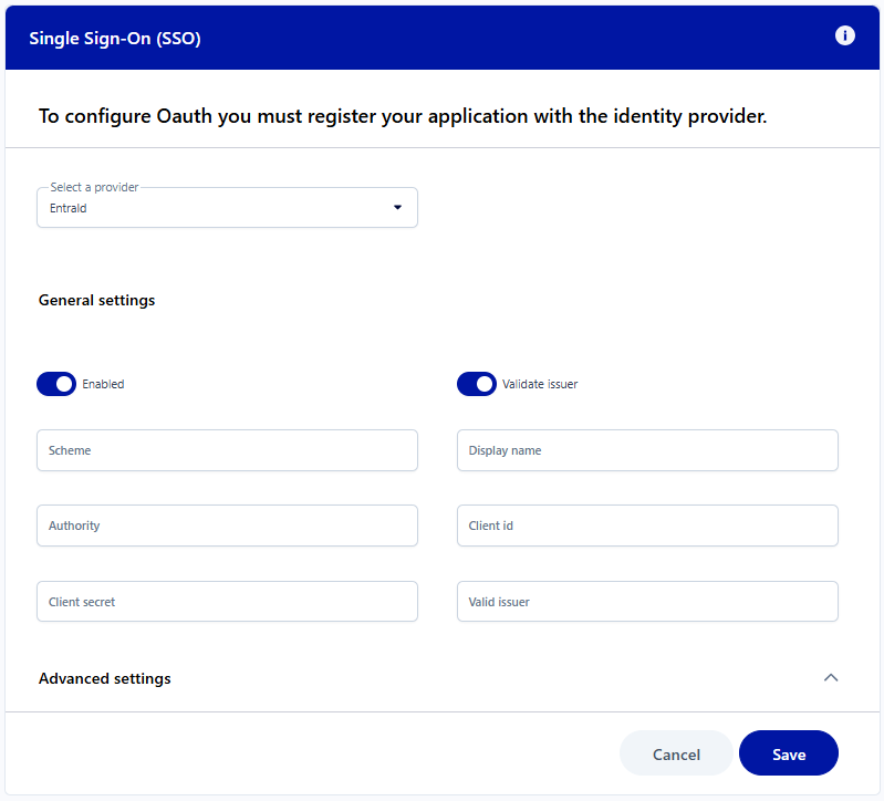 - Fill in the additional fields that appear, depending on the selected provider. It varies from provider to provider what information must be filled in. Important note: If your provider uses a Scheme name this cannot be changed so you must pick a relevant name the first time you configure SSO.