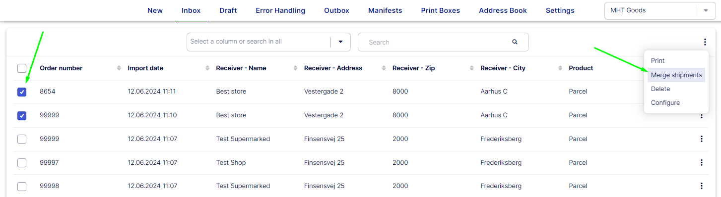 Merge multiple shipments from Inbox into one shipment! Using the merge feature, you can merge multiple orders to the same receiver. Choose which order should be the master shipment and edit the merged shipment before printing the label. This feature is useful if you import your orders to the Inbox and manually print the labels after picking and packing the order.