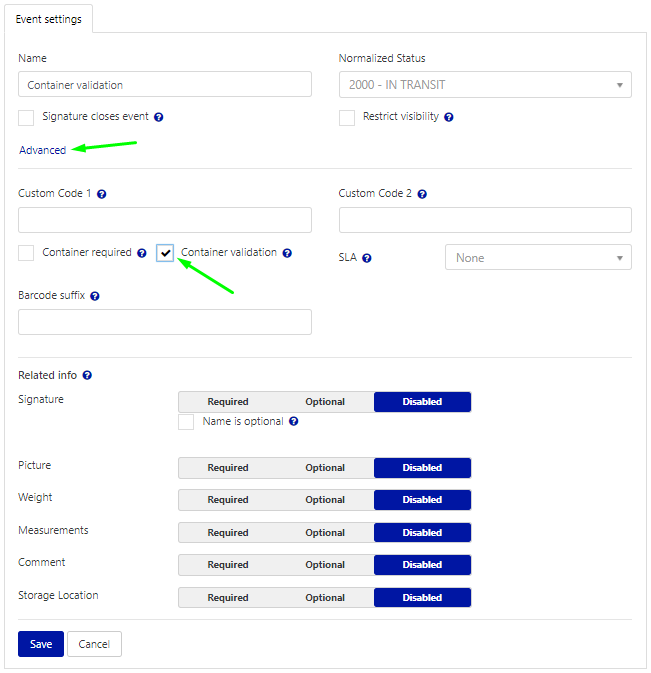- Name the event and select Container validation. (Please note that Container validation cannot be combined with any closing events, Related info options or Details from the Advanced settings tab.)