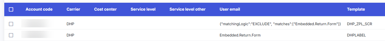 Dus, in dit voorbeeld zal voor deze accountcode, vervoerder DHP de DHPLABEL-template worden gebruikt wanneer de gebruiker Embedded.Return.Form is. Voor alle andere gebruikers zal de DHP_ZPL_SCR-template worden gebruikt zodat deze gebruikers nog steeds een ZPL-label genereren/printen.