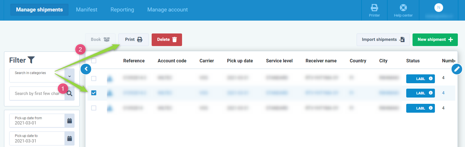 - Als je een zending wilt boeken en het label later wilt print, gebruik dan alleen de ‘Book’-knop bij het aanmaken van de zending. Je kunt het label later print door de zending te selecteren in Manage shipments en bovenaan het overzicht op print te klikken.