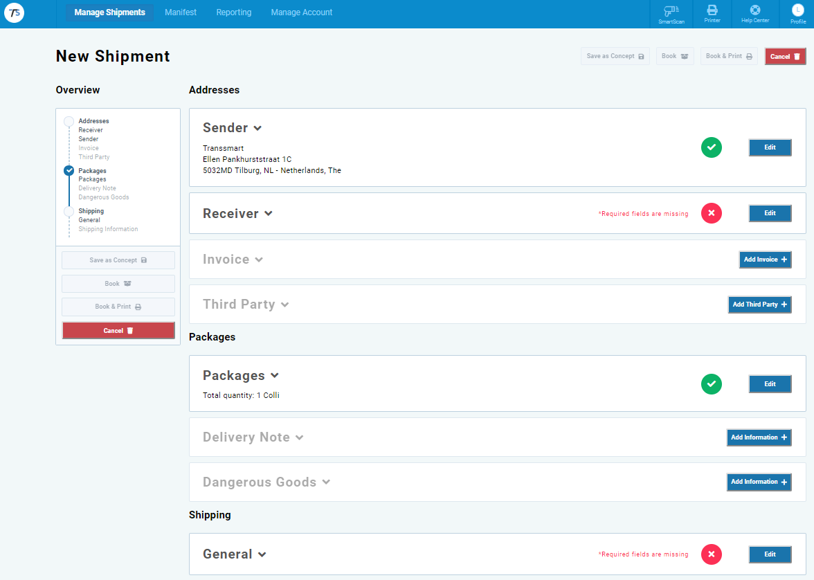 - Save as Concept: sla deze zending op om later verder te gaan. De zending wordt niet naar de vervoerder verzonden en is zichtbaar in het dashboard met status NONE.