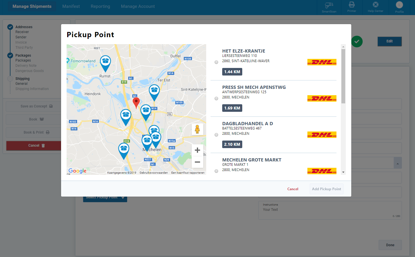 Selecteer een locatie en kies voor 'Add Pickup point'. Het adres van de gekozen locatie wordt automatisch ingevuld bij het ontvangeradres en de gegevens van de consument worden automatisch overgenomen in het Invoice-adres.