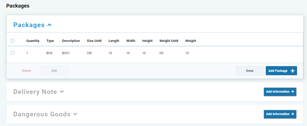 Voordat je een boeking kunt plaatsen, moet je het aantal pakketten invullen. Wanneer je je account hebt geconfigureerd via Manage Account, is standaard al één pakket vooraf ingevuld. De pictogrammen naast de pakketregels kunnen worden gebruikt om deze te bewerken of te verwijderen.