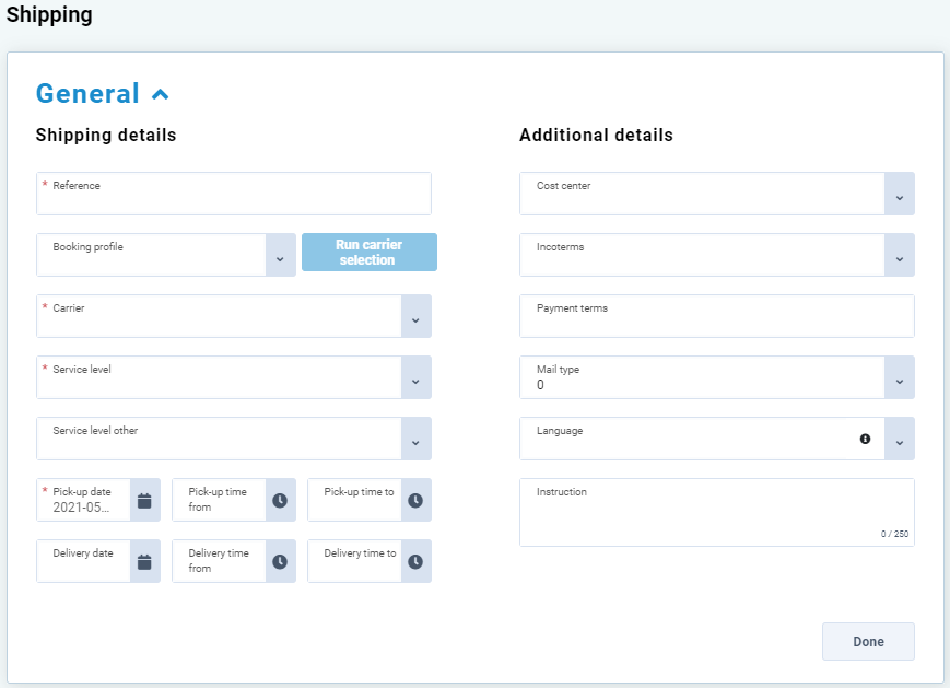 | Service Level Time Other | Kies een aanvullende serviceniveau-optie van de vervoerder, indien beschikbaar en gewenst (bijvoorbeeld ADR, zaterdaglevering, rembours). De standaardwaarde wordt automatisch ingevuld. |