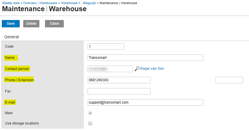 Wanneer de ophaalinformatie in de zending binnen Transsmart niet correct is ingevuld, wordt de informatie van Exact Online naar Transsmart niet goed verzonden. Dit wordt veroorzaakt door een onvolledig of ontbrekend veld voor 'warehouse' in Exact. Hieronder vind je de instructies waar 'warehouse' te vinden is en wat er moet worden ingevuld om de informatie door te geven aan Transsmart.