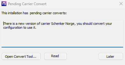 Oppdatere nShift On-Premises - Når migreringen til den nye modulen er initiert, vil du motta en popup-melding fra nShift On-premises som sier "Pending Carrier Convert". Klikk på knappen Open Convert Tool. Du kan også klikke på Later for å kjøre konverteringen på et senere tidspunkt, men vi anbefaler å gjøre det så snart som mulig. (Gå til seksjonen Starte konverteringsprosessen manuelt)