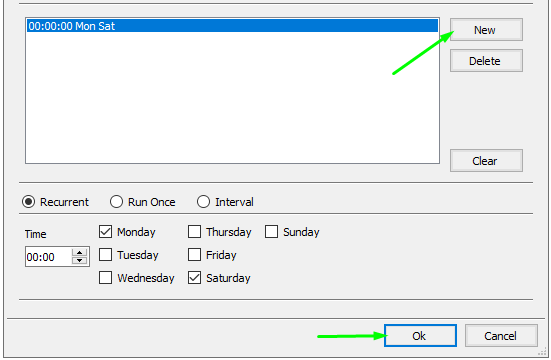- Klikk New for å opprette en tidsplan og velg Recurrent hvis oppryddingen skal gjentas eller Run Once for én enkelt kjøring. Du kan også velge Interval som lar deg angi start- og sluttid samt intervall i minutter.