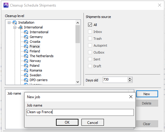 - Angi antall dager for sletting ved ønsket funksjon og klikk CleanUp. Du har også mulighet til å sette opp automatisk opprydding ved å velge Schedule og opprette en tidsplan på samme måte som ved automatisk opprydding av forsendelsesdata.
