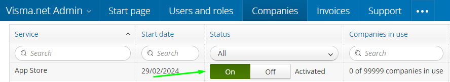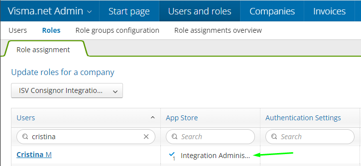 Før du går over til den nye autentiseringsmetoden, må du sørge for at selskapet ditt i Visma har App Store aktivert, og at Visma-brukeren din har rollen Integration Administrator for App Store.