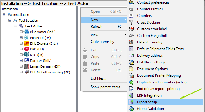 - Gå til Setup og naviger til nivået der du ønsker eksportoppsettet. Høyreklikk i høyre panel og velg New > Export setup.