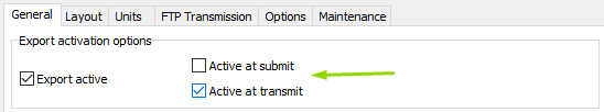- Velg når On-premises skal eksportere dataene. Velg Active at submit hvis eksportfilen skal opprettes når en etikett skrives ut, eller Active at transmit hvis den skal opprettes når EDI sendes til transportøren.