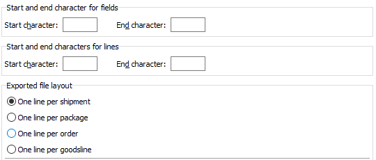 - Tilbake på siden for layout-konfigurasjon kan du angi om du vil ha spesielle start- og sluttegn for felt og linjer, og om du vil ha én linje per forsendelse eller et annet oppsett.