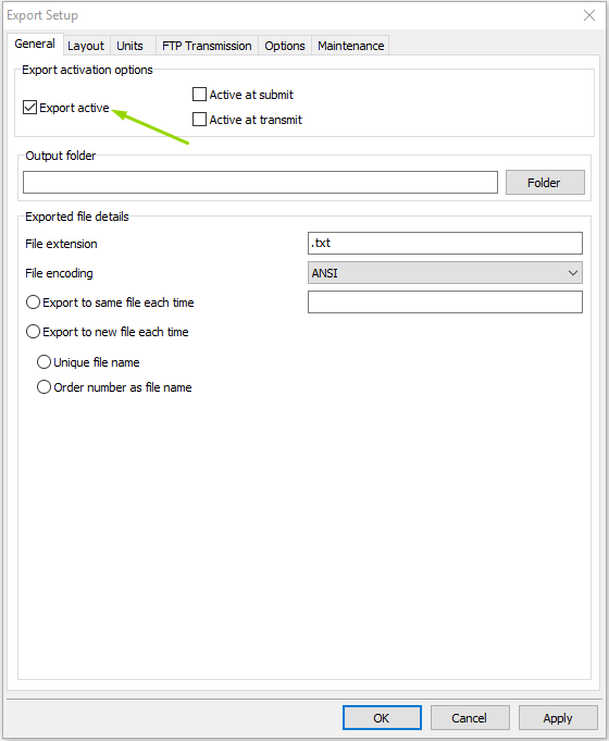 - Start med å krysse av for Export active. Eksportoppsettet må være aktivt for å kunne gjøre endringer.