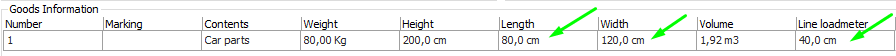 - Når beregningen av lastemeter er aktiv, vil alle verdier som legges inn i feltene Length og Width i Goods Information automatisk bli brukt til å fylle ut feltet Line loadmeter. Du kan alltid overstyre den automatiske beregningen ved å fylle inn din egen verdi i feltet Line loadmeter ved behov.