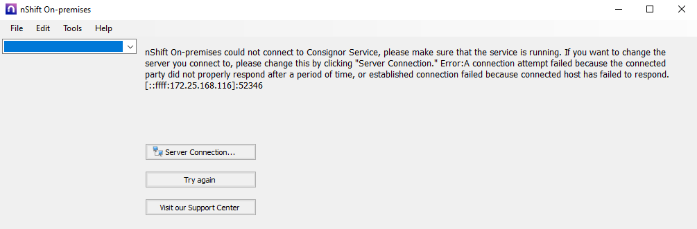 Hvis du får meldingen "Error: No connection could be made because the target machine actively refused it" betyr det at Consignor Service har sluttet å kjøre.
