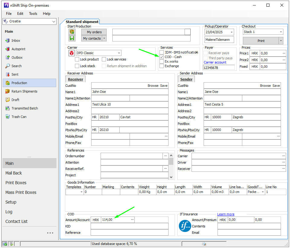 I produktionsvyn i Ship On-premises finns en COD-sektion längst ner. För att skicka en sändning med COD, ange beloppet enligt bilden. Detta fungerar endast om transportören stöder COD-sändningar, och vissa transportörer kan kräva en COD-tilläggstjänst.