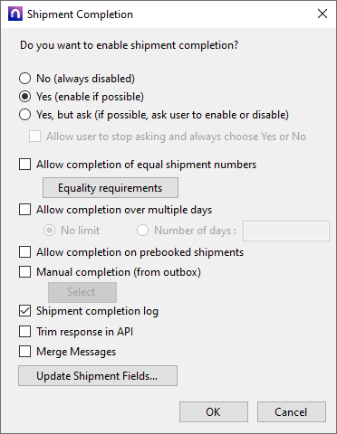 - Öppna inställningarna för Shipment Completion och markera Manual completion (from outbox) och Allow completion of equal shipment numbers.