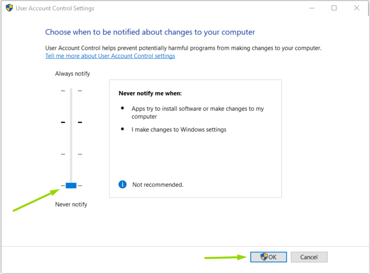 - Flytta reglaget längst ner till Never notify och klicka på OK för att spara ändringen.