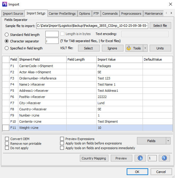 "Packages";"SE";"Test 1";"Test Name 1";"Test Address1";"22222";"Lund";"SE";"1";"Test Shipment";"10"