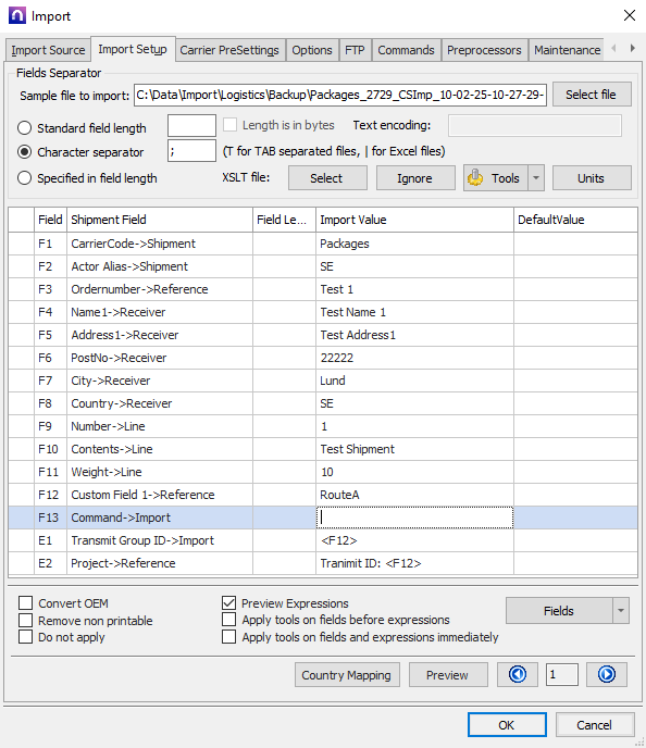 - F12 (Custom Field 1 -> Reference): Detta kommer att lagra din "Transmit Group ID" (t.ex. "RouteA", "RouteB"). Lägg till denna kolumn i din CSV.