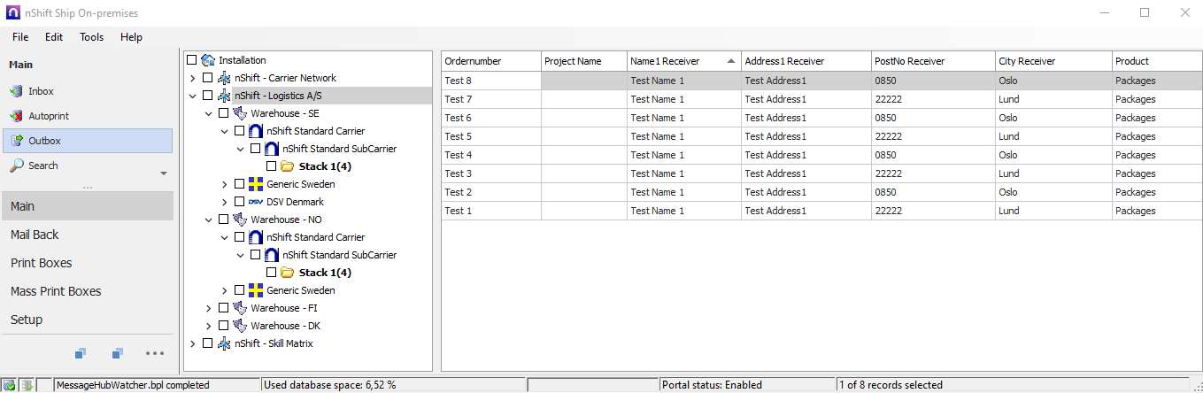 "Packages";"NO";"Test 8";"Test Name 1";"Test Address1";"0850";"Oslo";"NO";"1";"Test Shipment";"10"
