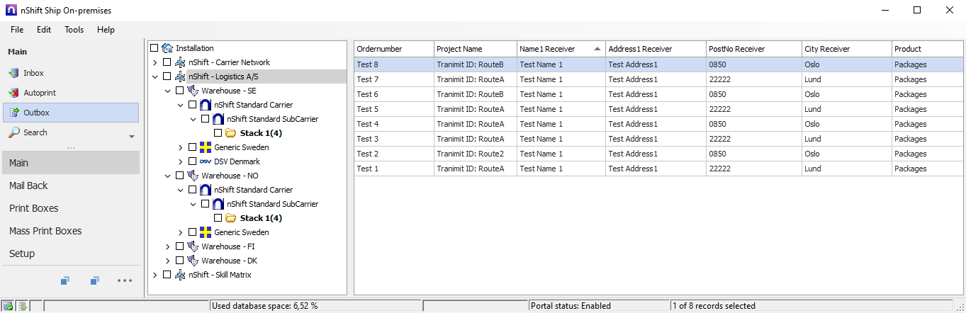 "Packages";"NO";"Test 6";"Test Name 1";"Test Address1";"0850";"Oslo";"NO";"1";"Test Shipment";"10";"RouteB"