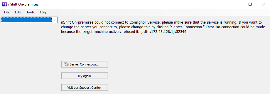 Om du får meddelandet "Error: No connection could be made because the target machine actively refused it" betyder det att Consignor-tjänsten har slutat att köras.